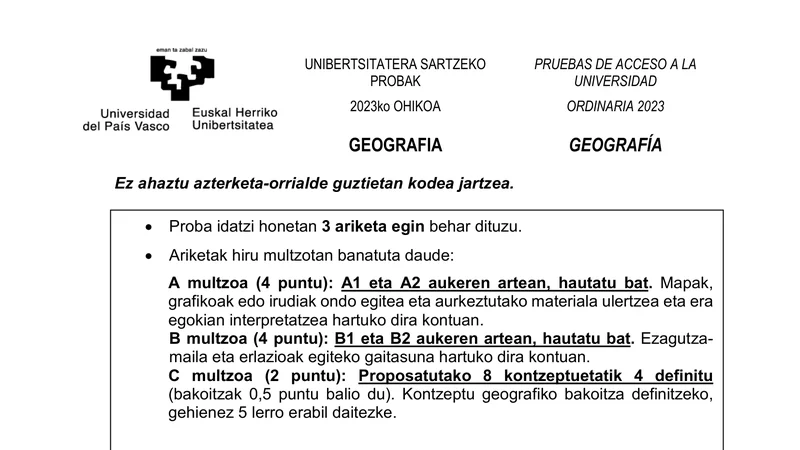 Examen PAU Geografía selectividad País Vasco — Ordinaria 2023
