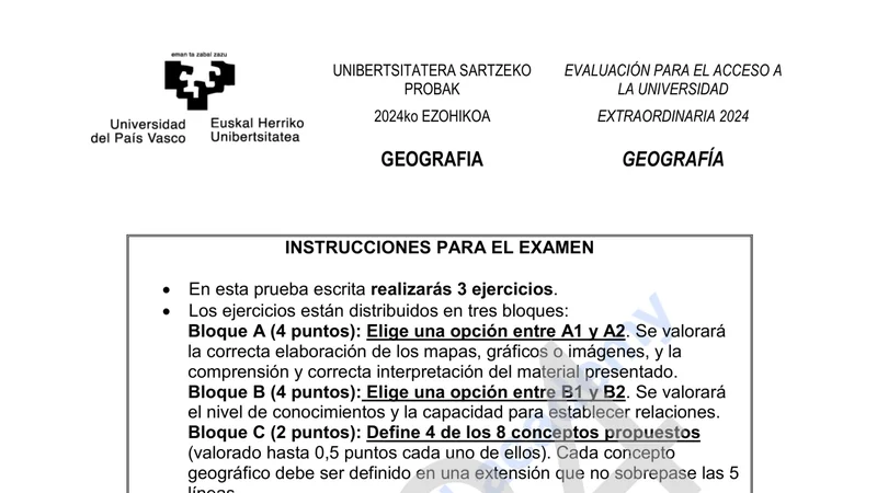 Examen PAU Geografía selectividad País Vasco — Extraordinaria 2024