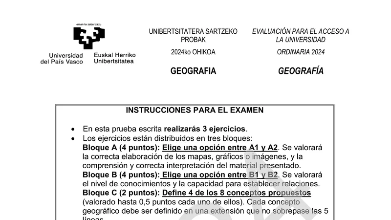 Examen PAU Geografía selectividad País Vasco — Ordinaria 2024
