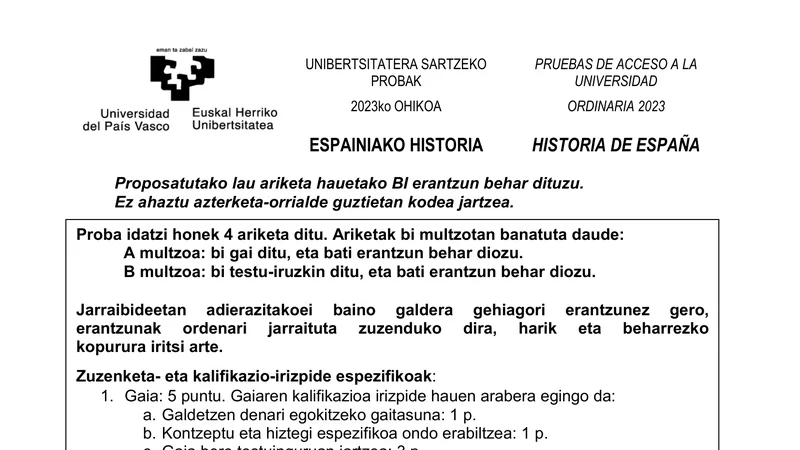 Examen PAU Historia de España selectividad País Vasco — Ordinaria 2023