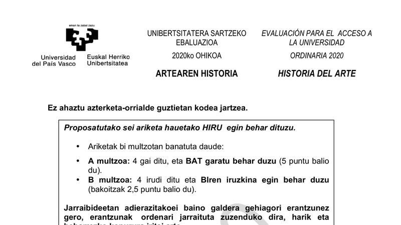 Examen PAU Historia del Arte selectividad País Vasco — Ordinaria 2020