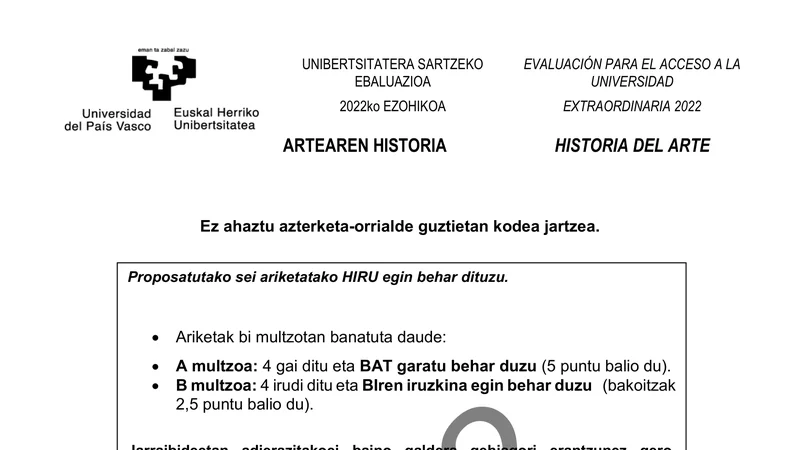 Examen PAU Historia del Arte selectividad País Vasco — Extraordinaria 2022