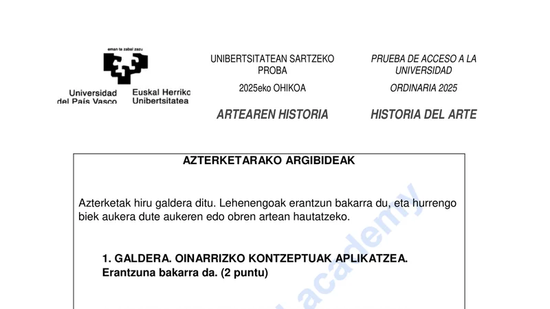 Examen PAU Historia del Arte selectividad País Vasco — Ordinaria 2025