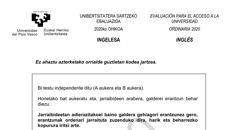 Examen PAU Inglés selectividad País Vasco — Ordinaria 2020