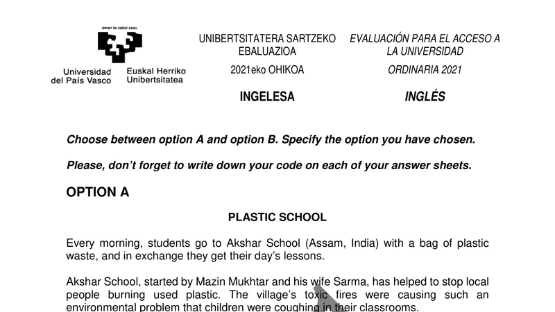 Examen PAU Inglés selectividad País Vasco — Ordinaria 2021
