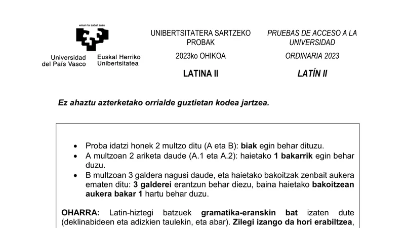 Examen PAU Latín II selectividad País Vasco — Ordinaria 2023