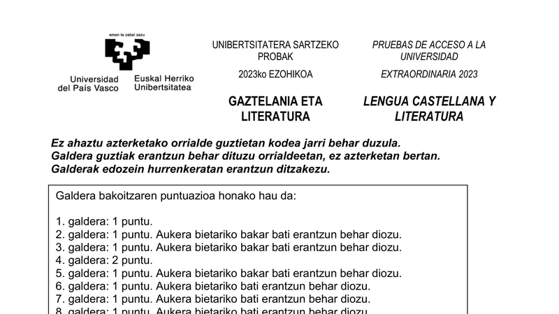 Examen PAU Lengua Castellana selectividad País Vasco — Extraordinaria 2023