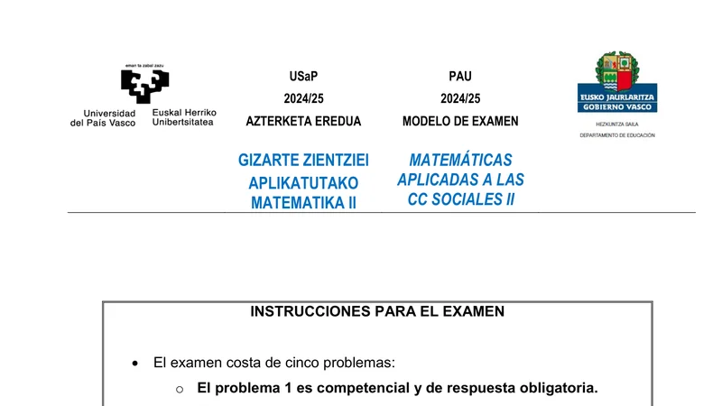 Enunciado oficial del examen de Matemáticas CCSS de la convocatoria ordinaria de 2025 de la EAU/PAU de País Vasco. PDF de 0.9 MB. Descarga gratuita y sin registro. ¿Preparando la selectividad? Calcula tu nota estimada o consulta la guía completa de selectividad 2026. Encuentra todos los exámenes de Matemáticas CCSS en País Vasco o explora las 17 comunidades autónomas.