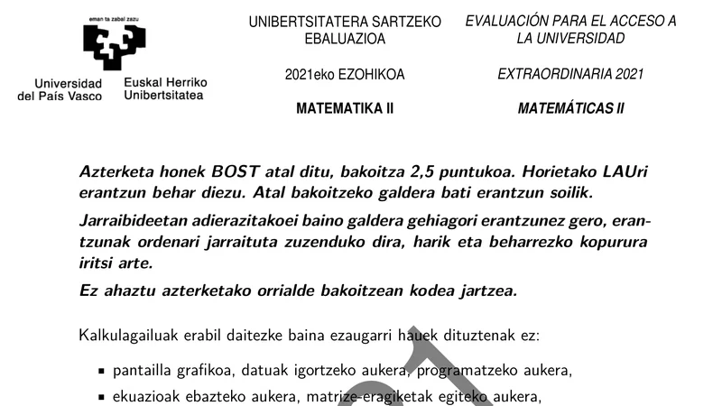 Examen PAU Matemáticas II selectividad País Vasco — Extraordinaria 2021