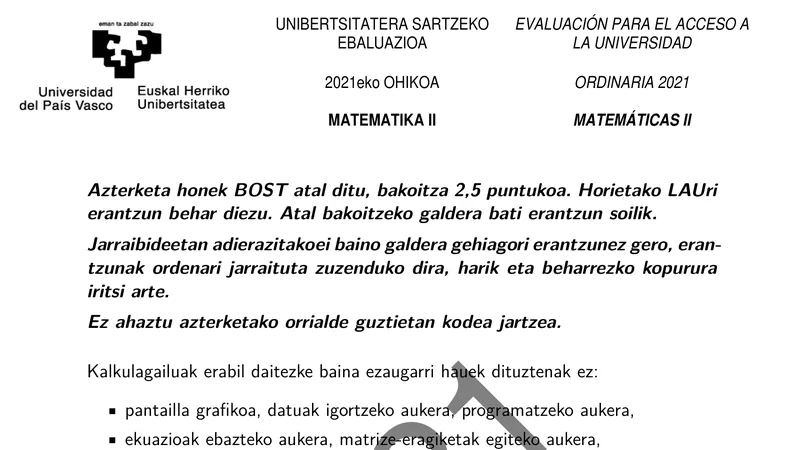 Examen PAU Matemáticas II selectividad País Vasco — Ordinaria 2021