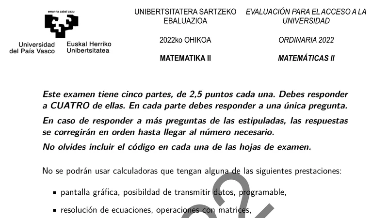 Examen PAU Matemáticas II selectividad País Vasco — Ordinaria 2022