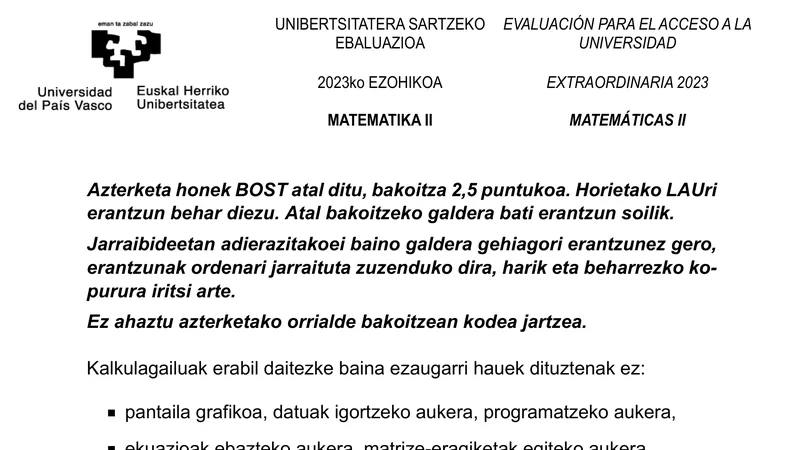 Examen PAU Matemáticas II selectividad País Vasco — Extraordinaria 2023