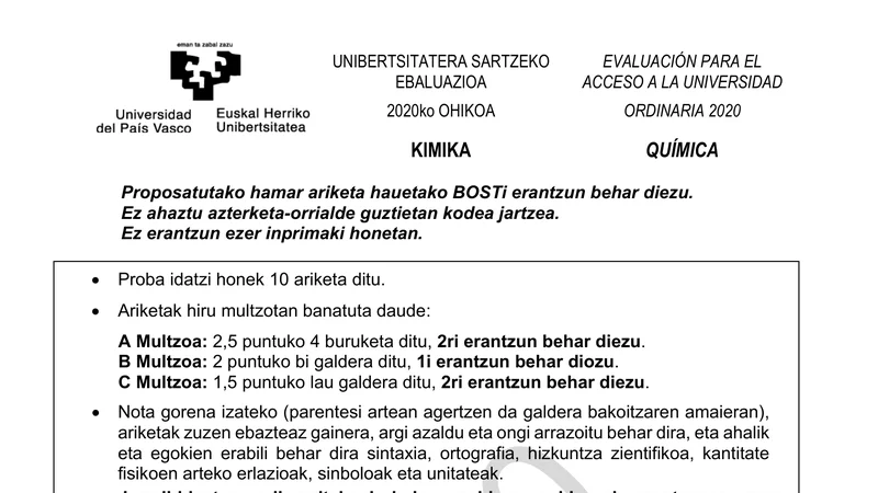 Examen PAU Química selectividad País Vasco — Ordinaria 2020