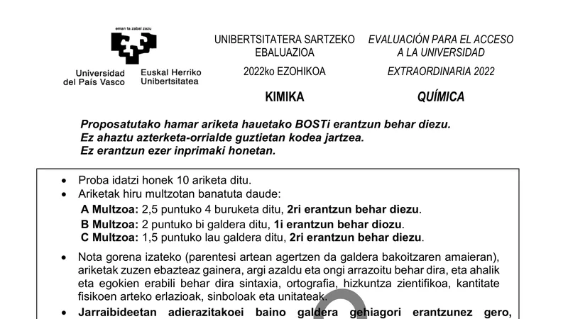 Examen PAU Química selectividad País Vasco — Extraordinaria 2022