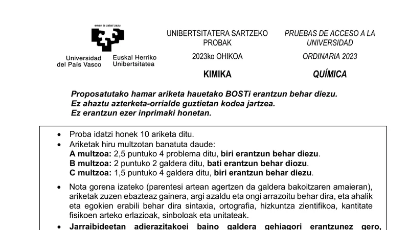 Examen PAU Química selectividad País Vasco — Ordinaria 2023