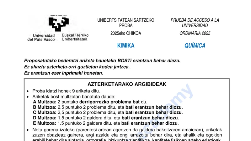 Reservar clase gratis →Examen de Química selectividad País Vasco (Ordinaria 2025)